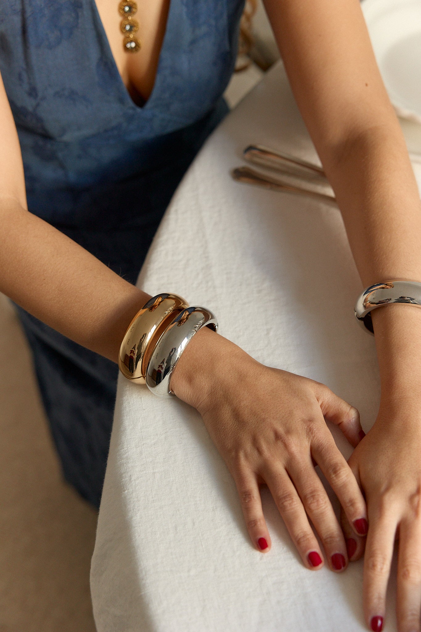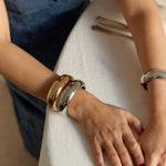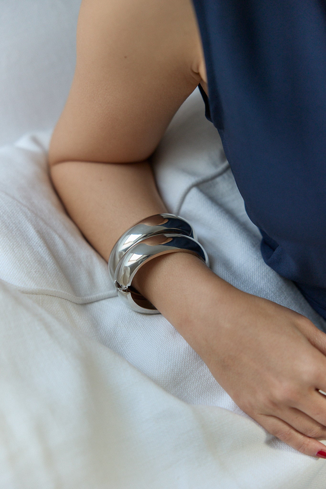 Brazalete ancho de acero inoxidable. Se abre y cierra con un muelle.