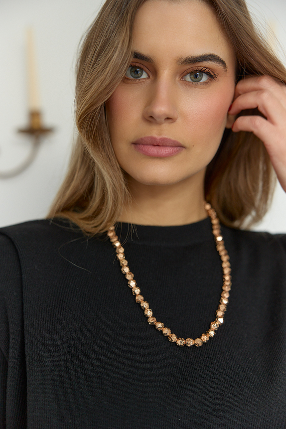 - Está compuesta por piedras en tono dorado, que aportan brillo y textura. El tono es un poco cobrizo.