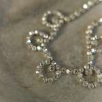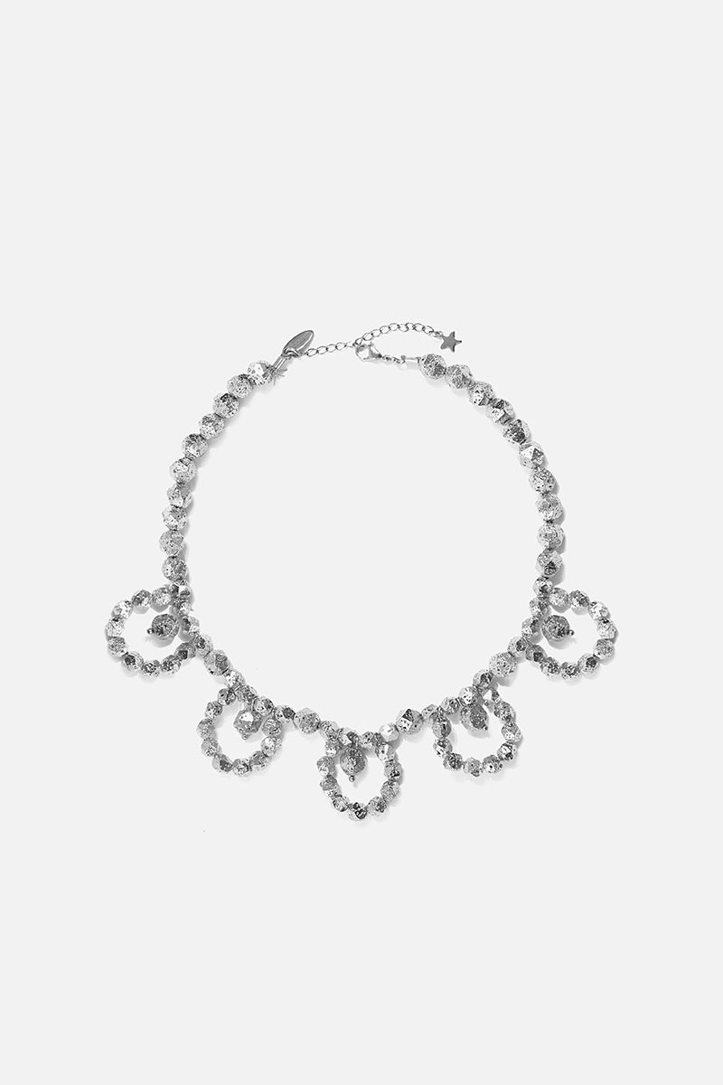 Collar tipo gargantilla con ondas pegadas al cuello de piedras en plata brillante.